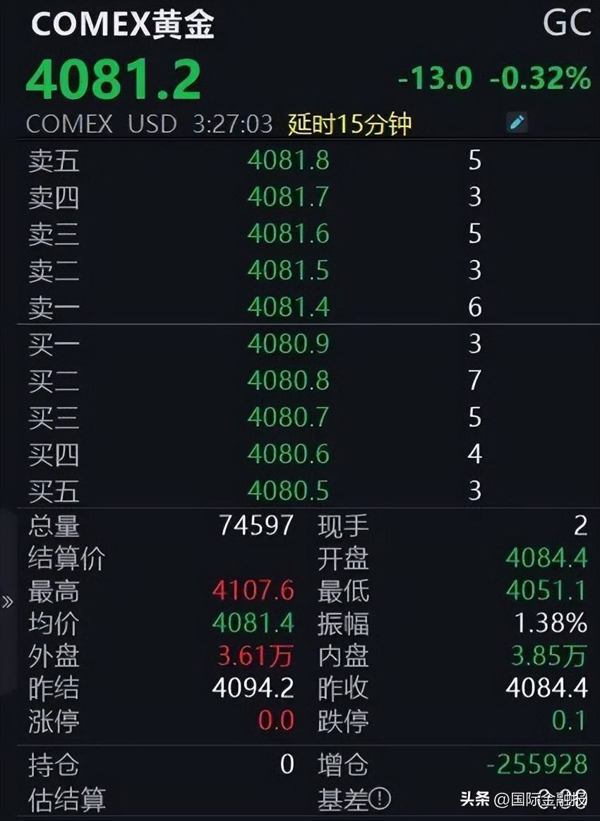 期货方面涵乔财富,COMEX黄金期货盘中亦发生跳水。截至记者发稿,COMEX黄金期货日内跌0.32%,报4081.2美元/盎司,盘中最低触及4051.1美元/盎司。