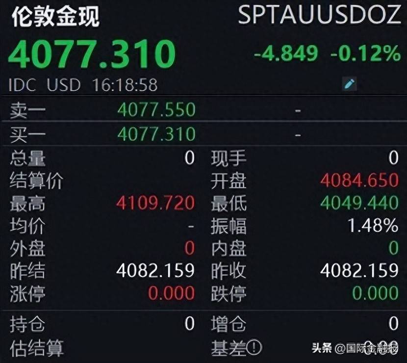 截至记者发稿,伦敦金现微跌0.12%,报4077.31美元/盎司,盘中最低跌破4050美元/盎司。